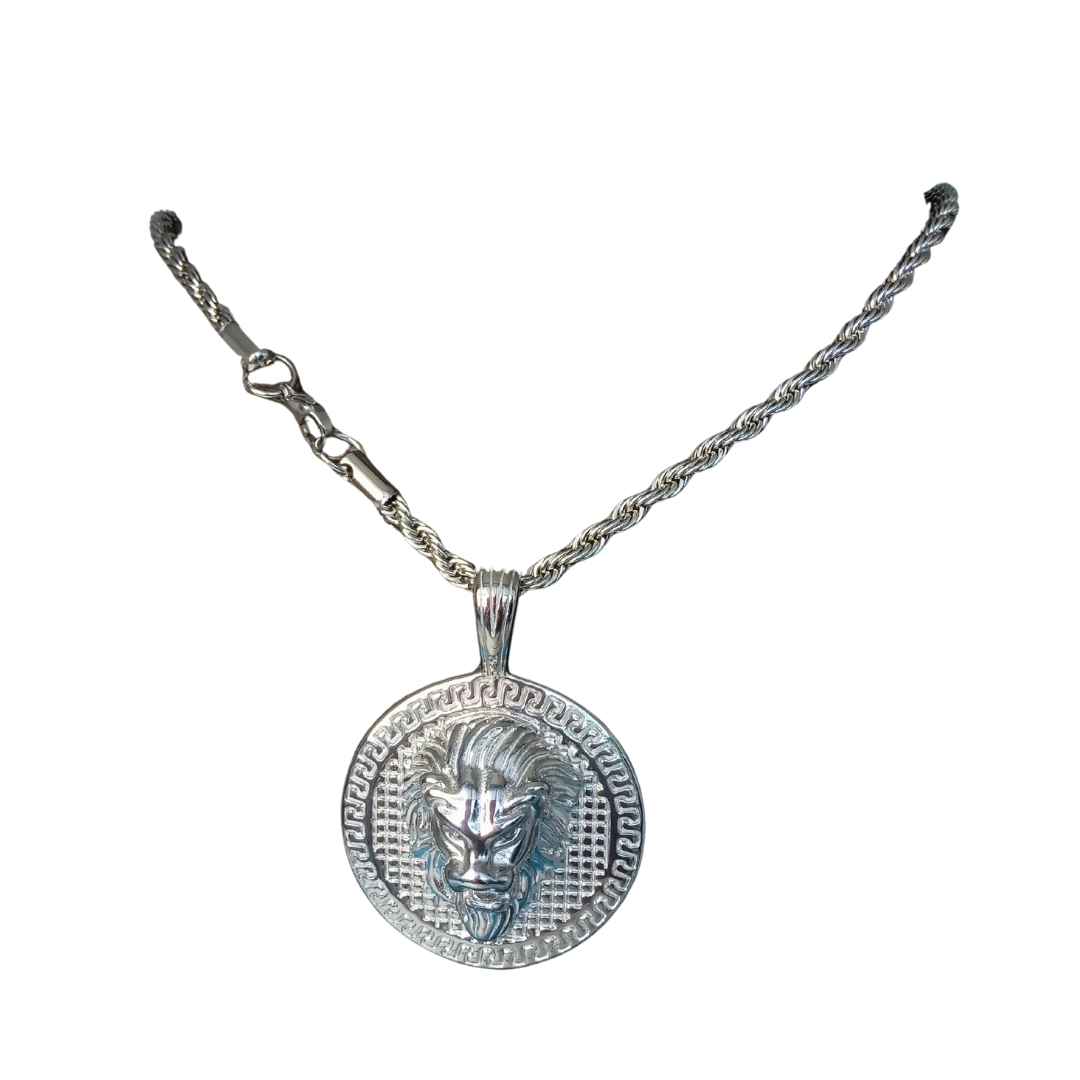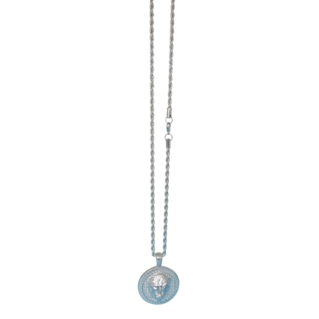 The pendant’s worn, aged finish gives it a vintage, battle-worn look. Hanging from a long chain, it’s easy to wear solo or layered with other pieces for a custom, lived-in style that speaks louder than words.